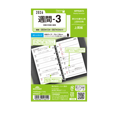 ・2023年日付入 16ヶ月分(2022年12月〜2024年3月) ・1月始まり、4月始まり両対応 ・見開き両面2週間スケジュール ・Refill Stockerアプリ対応 ・サイズ:ポケットサイズ/ミニ6穴(W76 x H126mm) ・梱包時:重さ約24g、厚さ約3mm ・リング:6穴 ・前年型番:WPR2273 ・ブランド:キーワード/Keyword ・メーカー:レイメイ藤井 (Refill_SP_Date) ※本製品を、お気に入りに登録するか、注文履歴から再注文いただくことで、翌年以降も、同じ商品の次年度版をより手軽に確実にご注文いただけます。