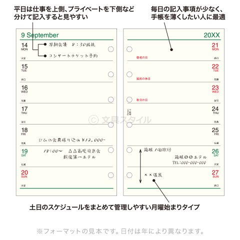 見開きで2週間分の予定を一目で確認できるのが特長です。