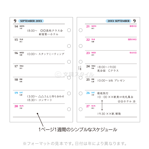 【週間・見開き両面2週間】 1週間の予定を1ページで見ることができる週間スケジュールリフィルです。
