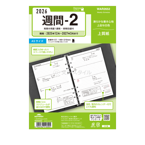 ・2023年日付入 16ヶ月分(2022年12月〜2024年3月) ・1月始まり、4月始まり両対応 ・見開き両面1週間スケジュール ・時間目盛付で、アポイント管理も一目瞭然 ・当月、翌月のカレンダー付きで便利 ・Refill Stockerアプリ対応 ・サイズ:A5サイズ(W148 x H210mm) ・梱包時:重さ約156g、厚さ約6mm ・リング:6穴 ・前年型番:WAR2252 ・ブランド:キーワード/Keyword ・メーカー:レイメイ藤井 (Refill_SA5_Date) ※本製品を、お気に入りに登録するか、注文履歴から再注文いただくことで、翌年以降も、同じ商品の次年度版をより手軽に確実にご注文いただけます。