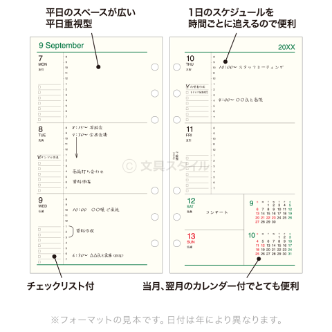 【週間・見開き両面1週間・時間目盛付・平日重視】 時間目盛付なので時間ごとのスケジュール管理がしやすくなっています。