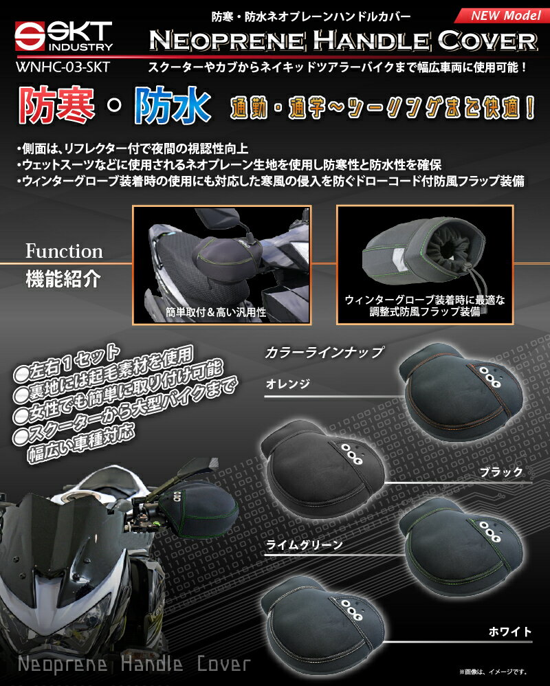 【品名】 防水・防寒 ネオプレーンハンドルカバー 【カラー】 ブラック・ホワイト・ライムグリーン・オレンジ・デニムブラック 【メーカー】 SKTインダストリー 【適合】 汎用品 ※原付〜スポーツバイクまで幅広い車種に使用可能 【特徴】 ●防水・防寒 ネオプレーンハンドルカバー ●冬の寒風や雨雪をシャットアウト! ライダーの手を保護。