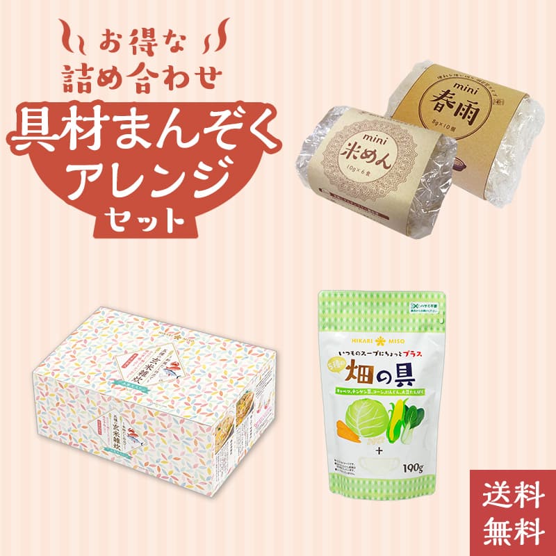 かにだし味噌 鶏ごぼう味噌 鶏白湯 鯛だし かつおだし 全5種詳細はクリック》 ・乾燥野菜ミックス 畑の具190g〔1袋〕5種類の畑の具:チンゲン菜、キャベツ、にんじん、とうもろこし、大豆たんぱく詳細はクリック》 ・ミニ 春雨 8g×10個入〔1袋〕個包装のミニ米めん。