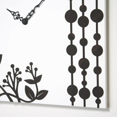 ホワイト塗装を施した正方形の木製パネルに、レーザーカットで切り出した木製の植物柄が、浮き出るように張り付けられています。