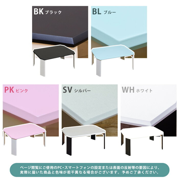 ローテーブルやリビングのセンターテーブルとして便利なサイズ! 折りたたんで収納できるので大変便利! 割と大きめのサイズなので勉強したり食事をしたり… 1人暮らしには特に活躍しそうです! カラー ブラック(BK) ブルー(BL) ピンク(PK) シルバー(SL) ホワイト(WH) ※ホワイト・シルバーの脚は黒、それ以外は白の脚になります。